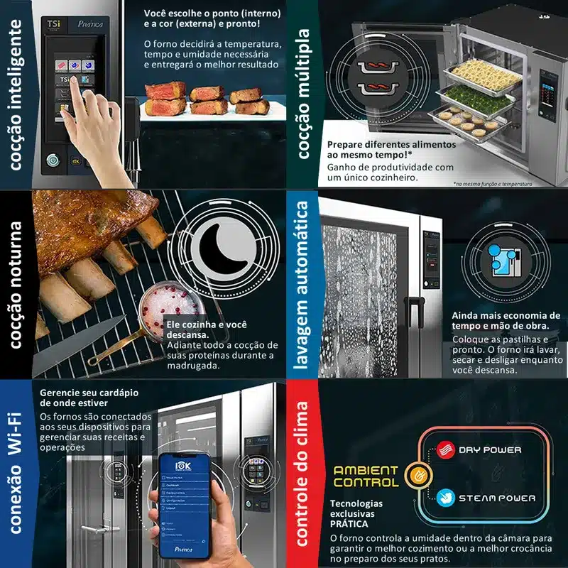– Cocção noturna: Enquanto você descansa, o forno TSi está trabalhando para você. Adiante a cocção de todas as proteínas do seu cardápio durante a madrugada. Após finalizar a cocção, o forno entra automaticamente em processo de conservação, mantendo a temperatura segura segundo a legislação e garantindo que o alimento não passe do ponto.